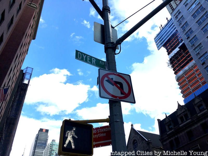 In this rare scenario of reversed borough fortunes, Dyre Avenue of the Bronx is longer, more prominent, and more well-known than its homonym, Dyer Avenue of Manhattan. The Bronx version carries an eponymous Subway line of the former IRT and is known as a commercial spine for the Eastchester neighborhood. Manhattan’s Dyer Avenue is nothing more than a glorified three-block extension of the Lincoln Tunnel‘s entrance ramp. Things only get more dire for this Dyer, as it is so short that it hosts no building addresses.