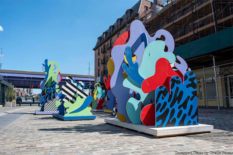 In South Street Seaport of Lower Manhattan, sculptures of kelp and coral formations created by Wade and Leta have been installed. Splashed with bright colors and replicating the inventive and organic forms of the ocean vegetation the title refers to, they make a vivid and playful addition to this summer’s assortment of public sculptures in the city. Seascpae Sculptures are located on the cobblestones at Fulton and Front streets, and are inspired by the historic ships docked nearby at Pier 16. The Seascape Sculptures will be on display until September 2019.