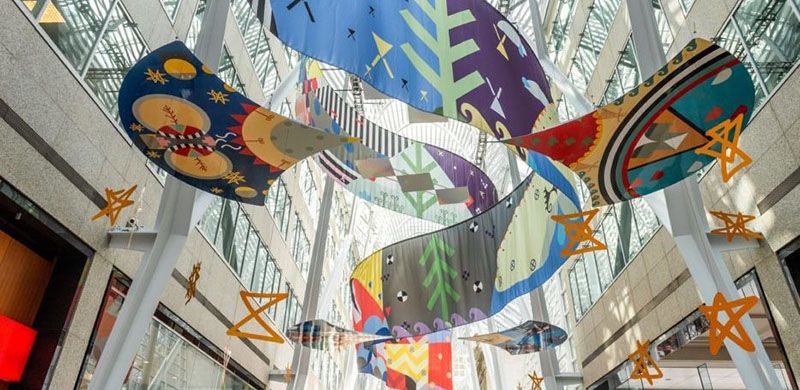 Photo courtesy of Arts BrookfieldInspired by the themes of ancestral and contemporary traditions, the new installation at Brookfield Place by Canadian-born artist Jordan Bennett draws from his Native heritage. The installation takes its name by Mi’kmaq, the word for “night” in his native language, and the materials are a combination of of 3M Diamond Grade reflective on aluminum and printed polysilk fabric. Through this reflection on the changing social dynamics of Native American communities, Bennett has woven a site-specific installation that considers the idea of storytelling as well as connecting a diverse audience of visitors. Tepkik will be on display from July 9th until September 6th at Brookfield Place.