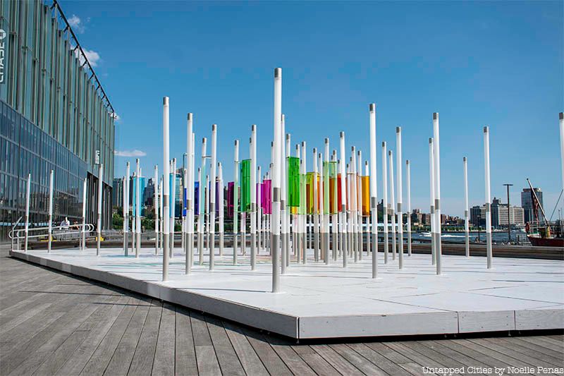 Photograph courtesy of Design Trust for Public SpaceSonic Gates is a public art installation that features a series of eight sound sculptures and murals in Staten Island placed along the waterfront, on Bay Street, and in Tappen Park. The installation is part of a larger project titled Future Culture: Connecting Staten Island’s Waterfront by the Design Trust for Public Space in partnership with Staten Island Arts. Works include the piece in the photograph above, which was made by Arthur Simms and is on display in the harbor off the Stapleton Esplanade, and a piece by DB Lampman, on display in Tappen Park, which consists of an assemblage of wind chimes that hang over the head of its viewers and encourages them to engage with the piece using senses besides sight. “The Future Culture pilots will highlight our borough’s rich cultural assets, from the Bay Street commercial corridor bustling with restaurants, stores and art centers, to Parks locations where dynamic community activities are taking place, to the spectacular waterfront, where we are reflecting Staten Island’s deep maritime heritage,” said Elizabeth Bennett, Executive Director at Staten Island Arts. Akin to the Design Trust for Public Space’s initiatives to reactive underutilized spaces under elevated highways (to be covered later in this article), this initiative looks to “inspire Staten Islanders and visitors to walk the underused pathways and unleash new possibilities for regenerating public spaces as a valuable community asset,” said Susan Chin, Executive Director, Design Trust for Public Space.