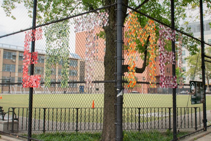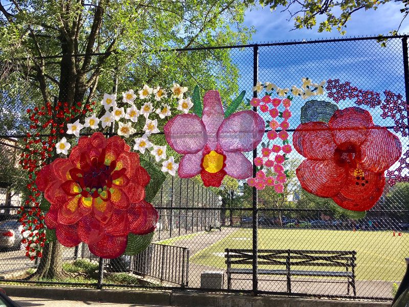 Two new installations are coming to the fence at Euguene McCabe Field in Harlem. One of those new installations if La Flor De Mi Madre created by artist Naomi Lawrence. This site-specific piece, which stretches 12-feet by 24-feet, is made up of a variety of vibrantly colored crocheted flowers that represent the different cultures that make up the surround community. There are Frangipani that represent the Ivory Coast, a Christmas Orchid for Columbia, Bayahibes for the Dominican Republic a giant Dalia for Mexico a Hibiscus for Ghana and more. The installation is being sewn together with help from community members. The flowers will adorn the fence from July 1, 2019 to July 1, 2020, at Eugene McCabe Field, 1718 Park Avenue at 121st Street in East Harlem.