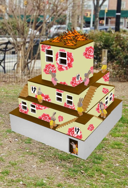 Rendering Courtesy of Yvonne ShorttRabbits are invading MacDonald Park in Forest Hills, Queens. Forest Hills resident and artist Artist Yvonne Shortt worked with her studio team and students from York College, Queens College, International High School of Health Sciences, and Academy of American Studies to cast and paint clay sculpted bunnies for her new installation Rigged?. The installation is a maze with stairs and windows that the bunnies are trying to navigate to get to the bunch of carrots on the top level. A sign on each level leads to the next staircase, until the level just before the top. It is impossible to complete the maze. In a secret entrance at the bottom of the piece, one rabbit hoards a stash of carrots. The rabbit maze is a commentary on the social, economic, and political system. It will be on display from July 10th, 2019 through July, 2020. Read on to see what outdoor installations are still on view from previous months and which pieces are going away this month!