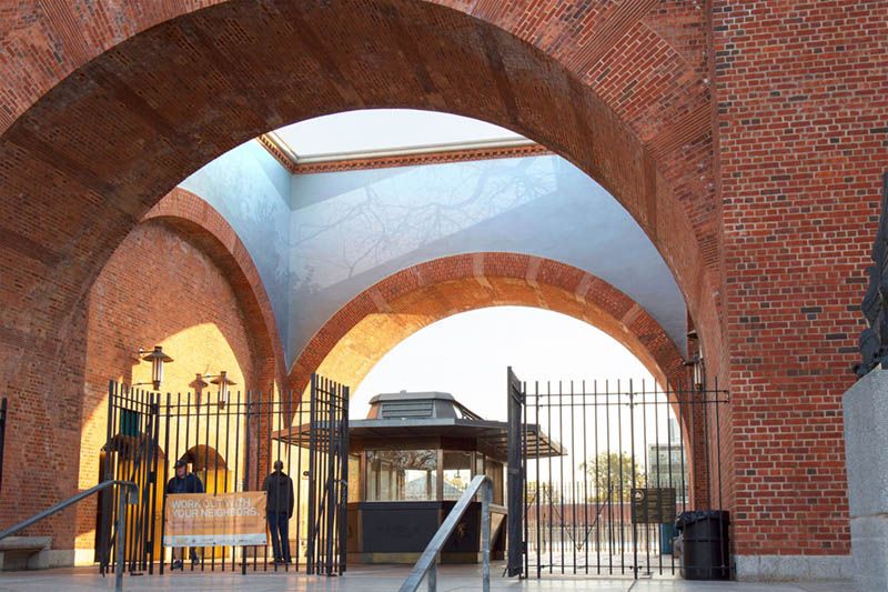 McCarren Park Pool in North Brooklyn features a dramatic archway entrance, which serves as a canvas for artist Mary Temple’s highly realistic paintings. At a quick glance, the installation appears to be rays of actual light projecting shadows of nearby trees. However, the shapes are “painted translations” of Juneberry, Hawthorn and other local trees.
