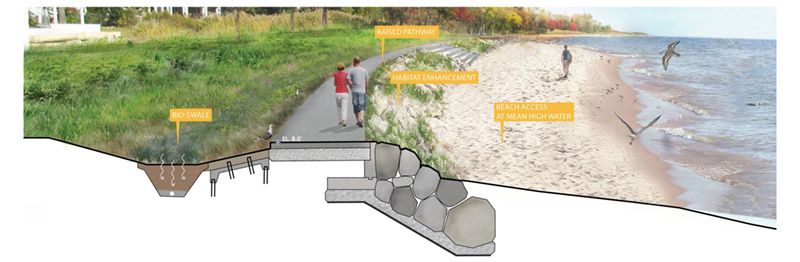 The design will not only reduce wave action and coastal erosion along the shore, but will help to enhance the surrounding ecosystems by implementing measures including wetland enhancement, hardened dune systems, shoreline plantings, maritime forest restorations and more.