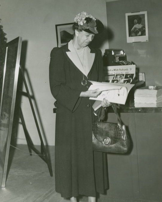 Eleanor Roosevelt with the Masterpieces of Art catalogue at the World’s Fair. Photo from NYPL Digital Collections.