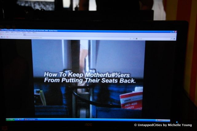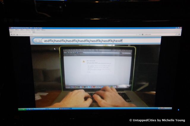 The content of Evan Roth’s show “When We Were Kings” precisely captures this in-between moment in time, when wi-fi, the laptop and iPads have made the traditional internet cafe virtually obsolete. When We Were Kings is “a reference to an era that began with the wide-spread adoption of the internet. It is a celebration of a time that is seemingly coming to close.” Aram Bartholl calls his work a “crossover of pop culture and open source…Hackers meet rappers!” Evan knew this was the location where he wanted his show after seeing images of Speedshow from last October. Each computer (or set of computers) played a different concept hosted on a unique domain, whether the image history of his own cache over a 24 hour period, flickering compositions of found Interent advertisements in industry standard pixel dimensions (banners, skyscrapers and boxes), the URL https://https://asdflkjhasdflkjhasdflkjhasdflkjhasdflkjhasdflkjhasdflkjhasdflkj.com/ (it works, try it!) and commentary on airplane travel, including “How to Keep Mother Fuckers from Putting Their Seats Back” and an animated gif of x-ray distorted frames from within airport security. Full list of pieces here.
