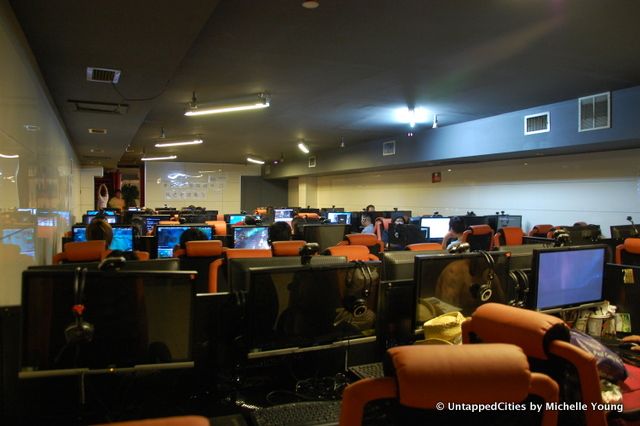 On Monday night, we went to check out Speedshow, an internet cafe takeover staged by Evan Roth (whose work is at MoMA for “Talk To Me”) and curated by Aram Bartholl (of Dead Drops). It surprised me that traditional style internet cafes still exist and this one at 90 Bowery is a throwback to those from the ’90s and early 2000s, with tons of kids playing first person shooter video games. It’s in the basement of the building down a narrow staircase, lending further mystique in a neighborhood known for its secret underground passageways.