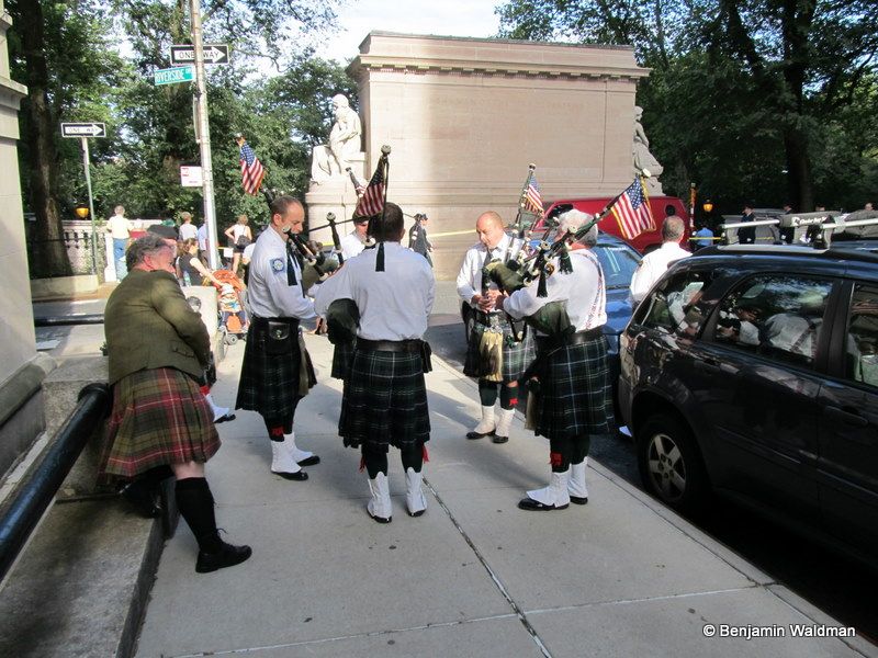 Uniformed firefighters and other servicemen congregated at the memorial as the bagpipes played: