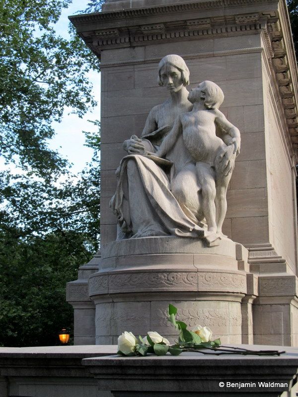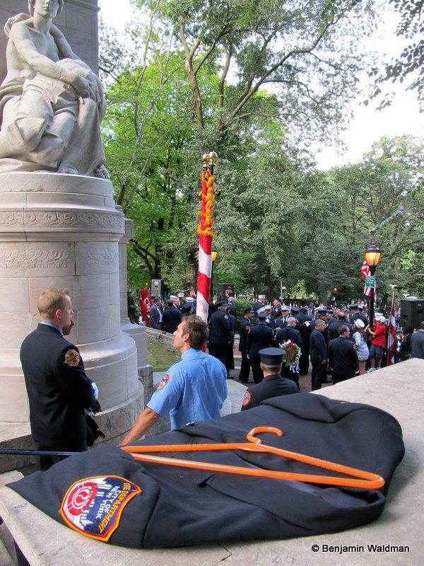 I arrived at the Firemen’s Memorial around 8:50 this morning. The memorial, located at 100th Street and Riverside Drive, was dedicated on September 5, 1913. It consists of a central marble structure, two sculpture groups, and a fountain. The memorial honors fallen firefighters and is the site of an annual memorial service for those who lost their lives in the line of duty. For the past ten years, the memorial has served as a place for families to mourn for their loved ones and for firefighters to remember their 343 comrades who perished on September 11th 2001.