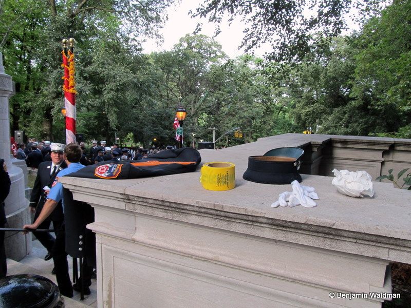 As I approached the front of the memorial I heard Danny Boy playing and a few firefighters singing along. At 9:03 a moment of silence was observed to mark the time when United Airlines Flight 175 struck the South Tower of the World Trade Center. The firefighters present removed their hats and bowed their head remembering where they were and what they were doing exactly ten years ago at that moment. Firefighters from across the country joined together to pay their respects at the memorial.