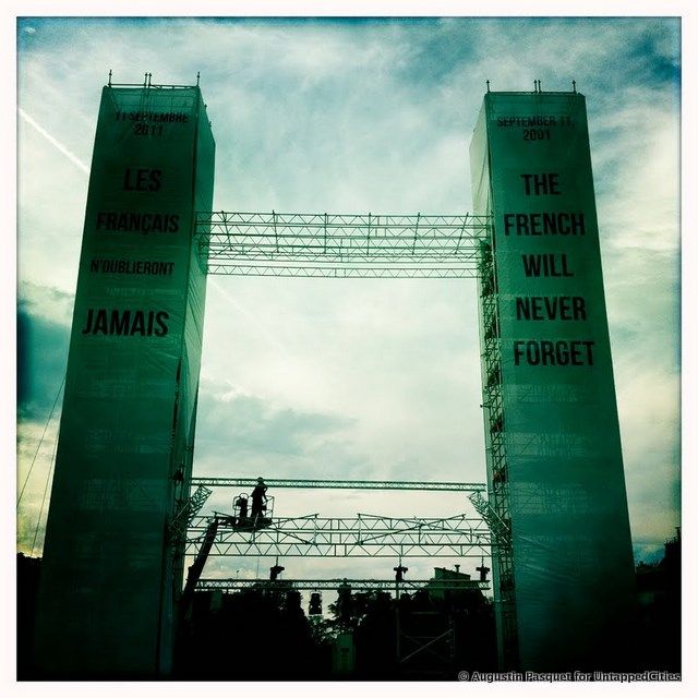 Paris will be remembering 9/11 at Trocadero, with this powerful temporary monument. It was still in progress this afternoon but we think it will broadcast the memorial tomorrow. Written in French and English–The French Will Never Forget–with the twin towers framing the Eiffel Tower–it’s an impactful statement about solidarity and monumentalism. And after all, Jacques Chirac was the first foreign President to fly above the ruins of the World Trade Center in a helicopter with Giuliani.