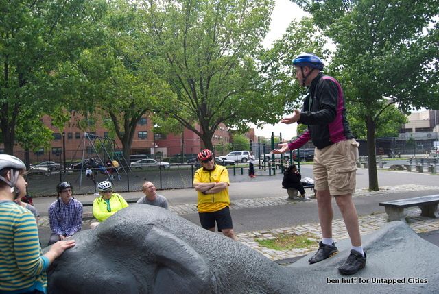 Riding on, we eventually reached our destination of Baisley Park Pond. As we entered through the playground, our tour guide made sure to show us his favorite part of the tour: a playground piece in the shape of the American Mastodon whose bones were unearthed by workers when they were dredging the land of nearby Baisley Pond. This creature probably hid in the area as the ice retreated at the end of the last Ice Age over 10,000 years ago.