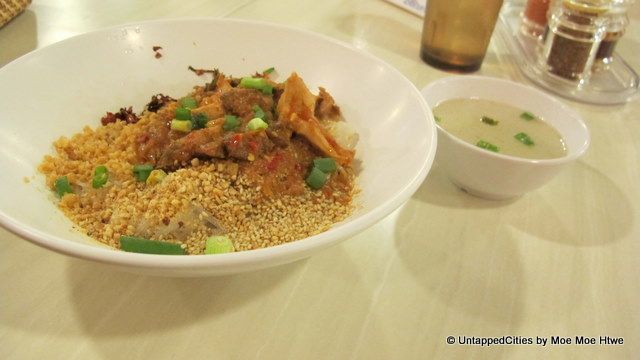 Other noodle dishes that you can find in Peninsula Plaza are “See Chat Kaut Swear,” a simple salad of yellow egg noodles with minced chicken, “Rakhine Mon Tee Thote,” a salad of rice noodles with minced fish–careful though–this is only for those looking for a fiery noodle salad.
