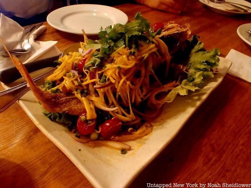 Popular appetizers include shrimp in a blanket, fish cake in a curry sauce with peanut relish, BBQ pork tender, and bean thread soup. The menu features 17 salads including Som Tum Talay, a shredded green papaya salad with shrimp, squid, mussels, and long beans, as well as raw shrimp salad and sour pork sausage salad. The Times recommends the fish basil, a fried whole or filleted red snapper with basil sauce, long hot chili, and mushroom, in addition to their rib-eye steak with drunk noodles and crispy duck panang curry. Also worth trying is the restaurant’s Pad Khee Mao with spicy chili sauce, frog legs with basil, and Kang Som sour curry with tamarind paste.