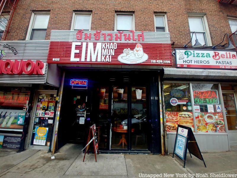 Eim Khao Mun Kai is one of the most well-known Little Thailand spots in Elmhurst, known for its elevated street food-style menu and ambiance. The restaurant, which only has a few tables and some wall seating, resembles a food stall with chickens hanging in the display case and a sign in Thai displaying its name. The interior features dark brick walls and wooden circular tables with metal stools, as well as a small open kitchen.