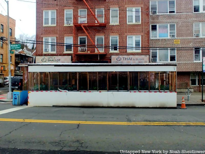 Open since 2005, Spicy Shallot is a Thai-Japanese fusion restaurant along Woodside Avenue. The Little Thailand restaurant features a more upscale ambiance with pink, gray, and blue chairs, gray brick walls with the restaurant’s name in neon, and disco ball-like light displays with lots of plants. Another sign toward the back of the restaurant reads “You’re hotter than spicy food” below a shallot.