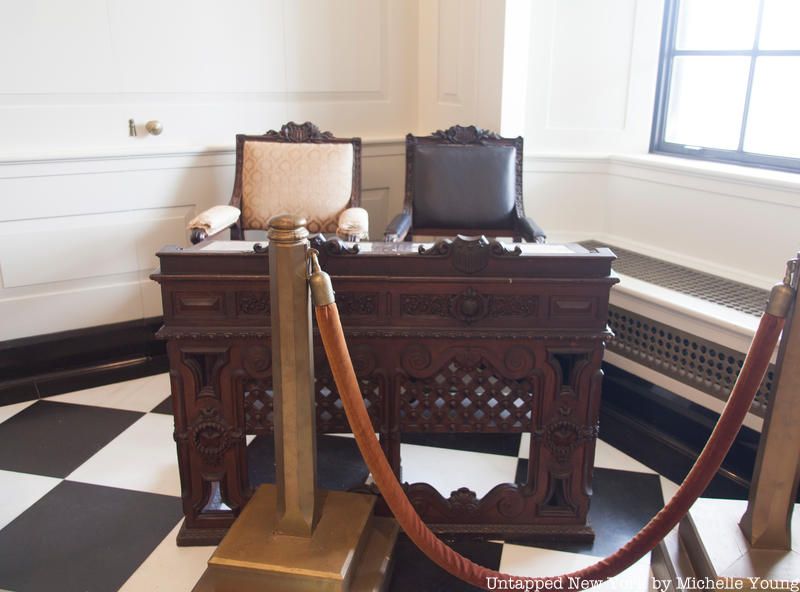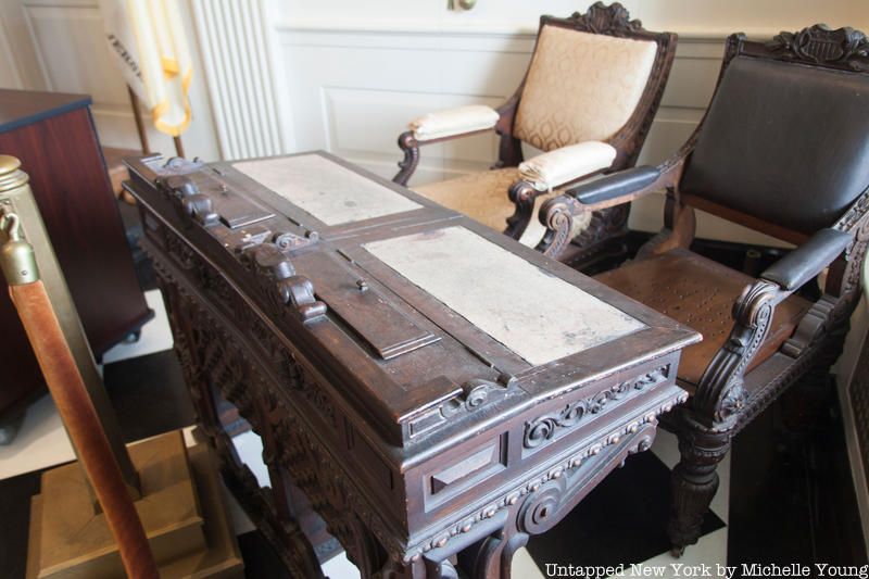 Following the media frenzy over the Rodin Napoleon, the bust was loaned to the Rodin Museum in Philadelphia for an exhibition, sub-loaned by the museum, and earlier this year, acquired by a private buyer through auction for a rumored $8 million. The bust, entitled “Napoléon Enveloppé Dans Son Rêve,” or “Napoleon Wrapped in His Dream,” will therefore not return to Madison, but according to New Jersey Hills, no other works of art are planned to be sold from the borough hall. That includes one piece, unlisted in the pamphlet we were given, but revealed to us on our visit by a clerk with a gleam in her eye. Upstairs in the Council Chamber, you’ll find a desk rumored to belong to Abraham Lincoln, she said in nearly a whisper. Then even more intriguingly, she said that the room is normally alarmed but she was sure a woman upstairs in a nearby office would be happy to disengage the alarm for us to take a look.