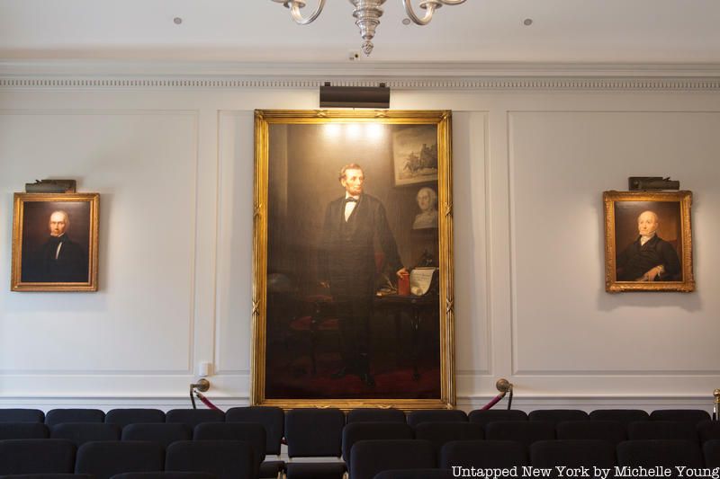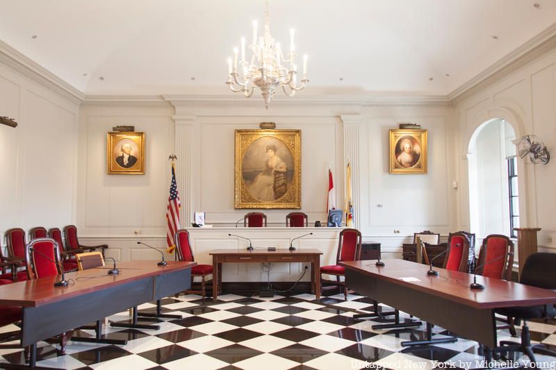 Inside the Council Chambers in Madison, NJ. A portrait of Geraldine R. Dodge is at center, painted by Freidrich A. Von Kaulbach.
