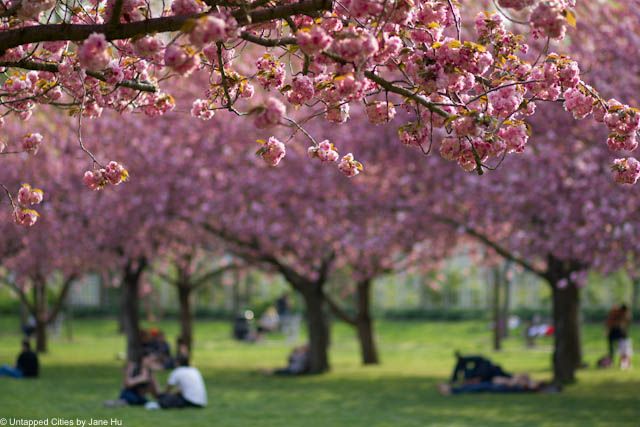 In Japan, everyone tunes in to the weather bureau’s special blossom forecast in order to catch the 1-2 week window of blossoms in the spring. Here in New York, our equivalent is the CherryWatch Blossom Status Map on the Brooklyn Botanical Garden website. Looks like there are still a few days left to catch the action, as peaked trees start to lose their blossoms, falling to the grass like a flurry of delicate pink snow.