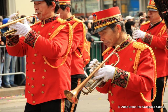 By quarter to one, several more dragons had swirled past the crowd and a tuba-clad marching band playing American standards had come and gone. An ambulance from the New York Queens Hospital decked out in lucky red lanterns rolled along, as the Caucasian EMT called out “Happy New Year” in Chinese to the delight of the crowd. The parade ended with a bang of firecrackers outside the Queens Crossing Mall. Welcome to the year of the snake. Time for some soup dumplings.