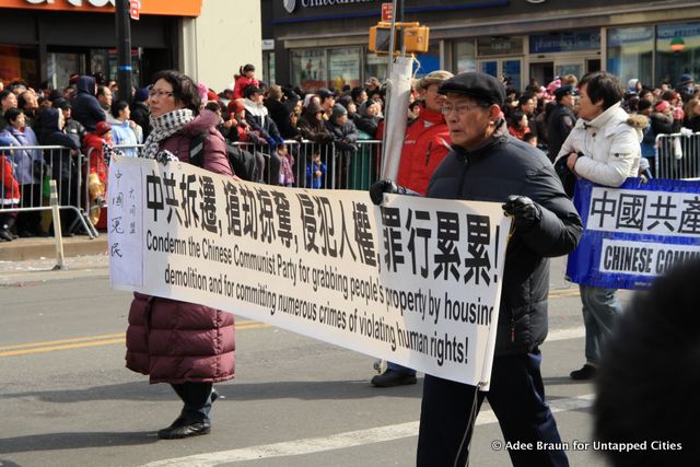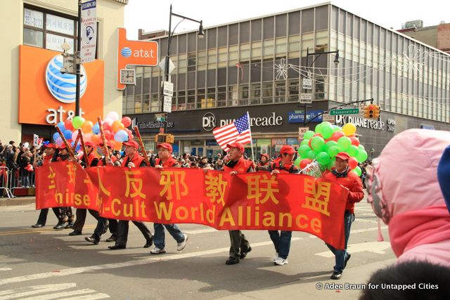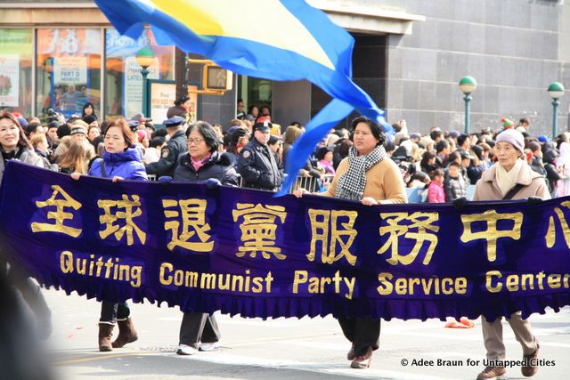 The parade not only represented market competitors, but ideological ones as well. Among the marchers was the Chinese Anti-Cult World Alliance, a group that denounces the spiritual minority group Falun Gong. Following them were members of Falun Gong itself, who are convinced that the Chinese Anti-Cult World Alliance is secretly working for the Chinese Communist Party. Some Falun Gong are also involved in the local Quitting Communist Party Service Center, which aims to help Chinese immigrants swear off Communism. They too carried a banner in the parade. Tensions between all three groups are a common source of fodder for the local Chinese language media and is a Flushing version of the larger ideological battle raging on back in China.