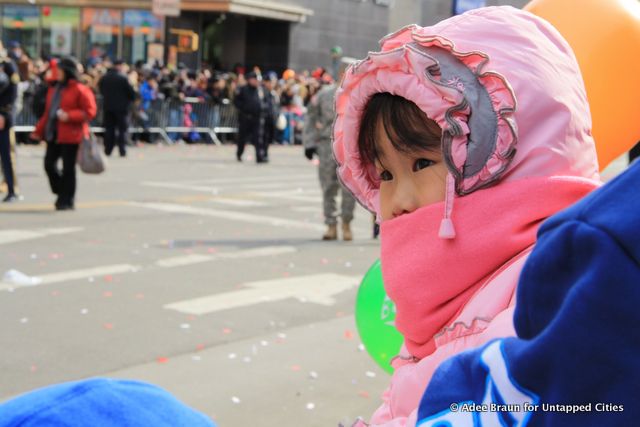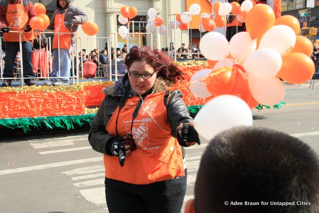 As the K-pop receded, the lovely ladies of the F&T Group (which is re-developing a five-mile stretch of downtown Flushing) came into view in their long gowns and tiaras as they waved genially to the crowd. This was followed by one very energetic, dark-suited real estate agent on the Skyviewparc Luxury Condominiums float (studios starting at $375K). The Verizon team fired off confetti launchers, and the Home Depot crew handed out orange balloons.