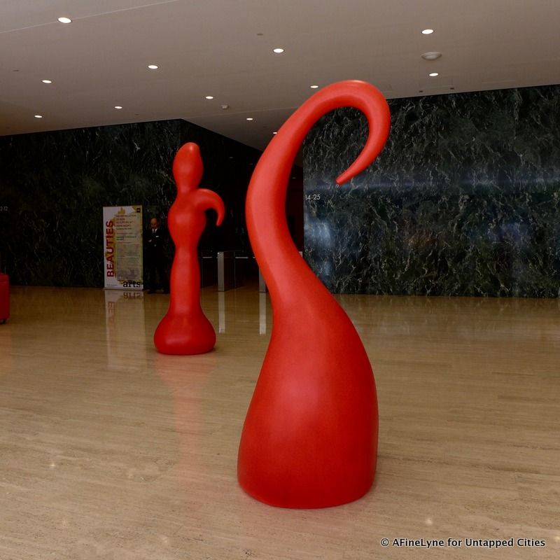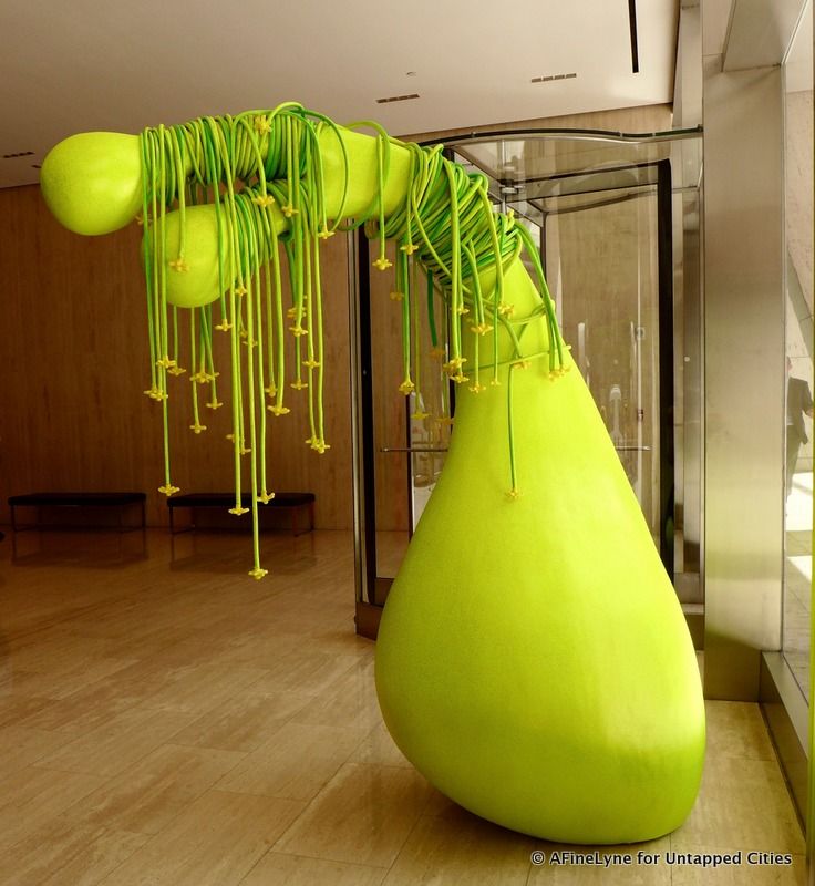 John Monti, who hails from Brooklyn, created each piece out of cast resin, with a coated high-gloss finish. His experience as a sculpture artist, costume and set designer, bring new life to the wide open space of the Grace building, which was commissioned by W.R. Grace in 1974, and designed by Gordon Bunshaft. Monti has exhibited both nationally and internationally, and his work is included in private and public collections at the Metropolitan Museum of Art, Brooklyn Museum, Yale University Art Gallery, and the Eli Broad Family Foundation – naming just a few.