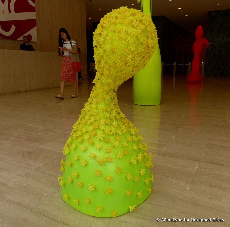 The marble lobby of the iconic Grace building on 42nd Street (that curved building along Bryant Park) has turned into a playful garden of colorful “flower clusters.” Entitled Beauties, the seven site-specific sculptures, created by artist John Monti, are an eye-popping entrance to a New Yorkers serious workday. People entering through the revolving doors were taking a sudden pause before flashing a quick smile, and a quick cell phone shot of the fantastically colored installations, now sprouting in their lobby. Even the security guards seemed to be enjoying the play-things, and the reactions from those on their way through the grand African mahogany paneled lobby. Below are a few photos of Beauties.