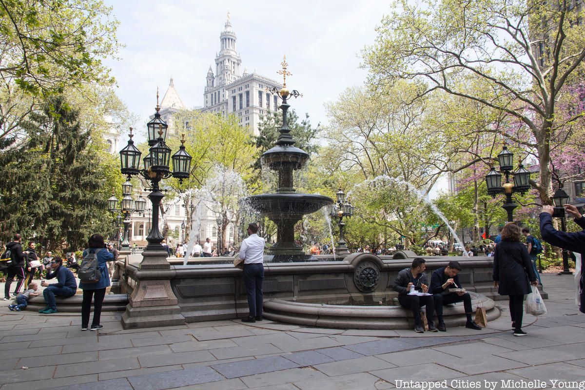 The park’s western boundary was a Native American trail that later became Broadway. In 1765, New Yorkers protested the Stamp Act at the site, and a year later the first “Liberty Pole,” a mast topped by a vane with the word “liberty,” was built at the site (a replica stands between City Hall and Broadway, near its original location).