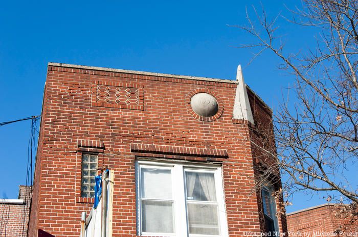 It seems entirely possible that in 1939, with the arrival of the World’s Fair just nearby, the Tryon and Perisphere were added in excitement. Perhaps there was once another rectangular detail (with the diamonds inside) on the front facade, and it was taken out and swapped with the Perisphere. The brick does look a little more uniform than the ones on the left side, which seem older, but this is just conjecture. Do you have more details about this house? Send us a message!