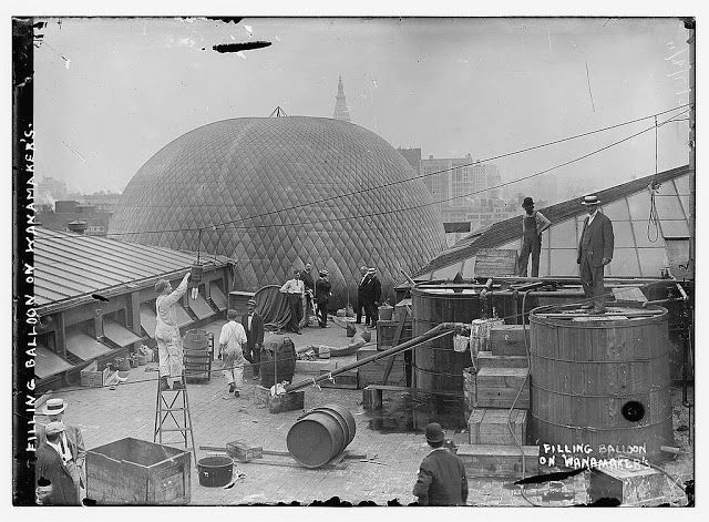 The New York City department stores were also getting over-the-top displays, as The Bowery Boys reported last week. In 1911, Wanamaker’s launched a hydrogen balloon off its department store at Astor Place to be landed near the store’s flagship location in Philadelphia. Things didn’t go as planned though, according to the Bowery Boys because “Instead of floating southwest, it headed due north. After an hour and a half of wandering blindly through the clouds, the balloon ungraciously came down — in Nyack, New York.”