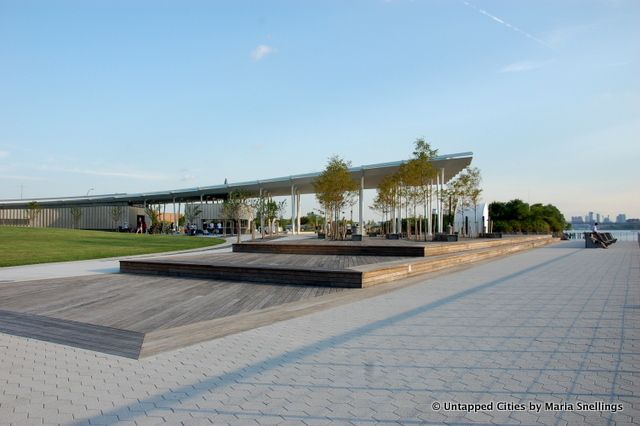 The park, designed by Weiss/Manfredi and Thomas Balsley Associates runs five acres along the waterfront but will eventually extend to 11 acres. In addition to the beautiful location and view, the park offers a spacious escape from city that also takes into account some of the industrial elements in this waterfront corridor. Some of its current highlights include an elevated deck facing the Manhattan skyline, a dog park with a fountain, a sand park, a landscaped garden with old railroad tracks, and dozens of chairs of different designs.