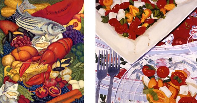 Sandra Bloodworth: Up until 2003 my work had become predominantly figurative such as Subway Stories, which evolved from the NYC subway and the people and my experiences there. With these figurative portraits, I tried to both capture the personality of the subject and, in turn, reveal some of my own. In 1999, my life changed drastically when I met my future husband, Fred May. We both loved to cook and so we began entertaining friends and family with some frequency. The two of us would always lay out a big meal and photograph the tablescapes which became more elaborate over time. One day in 2003, as Fred was cooking and I was preparing the table setting, a friend, Natasha Hopkinson, suggested that I should be painting the tablescape and the meal we were serving – and so the “intimate feast” was born. It is a series of about 80 paintings that I worked on in every spare minute I could cobble together for four years. The portraits of meals were about celebrating the personal part of my life and the shared journey with my husband.