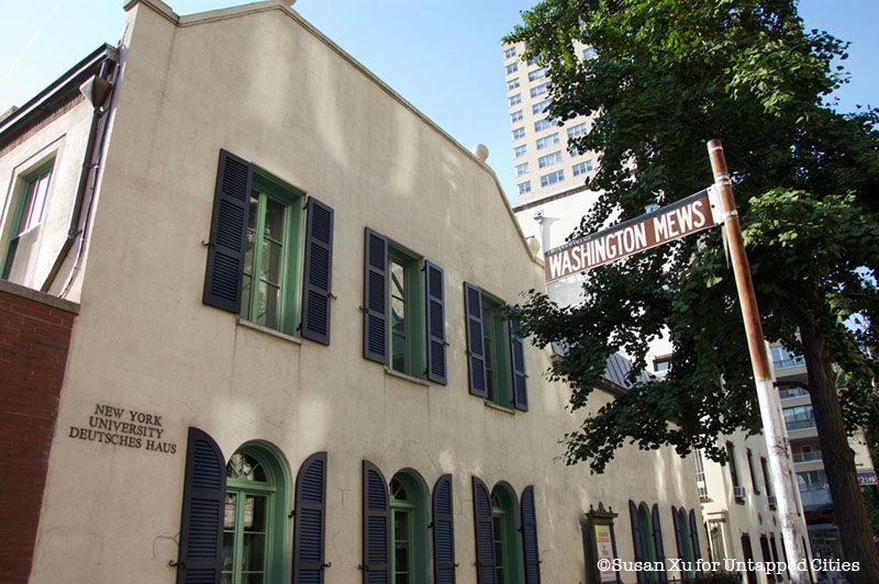 With its beige facade, lined with red brick and decorated with a green double door and window shutters, the Deutsches Haus leaves a lot to the imagination. The building’s exterior immediately hints at a long and storied history: in fact, according to a timeline displayed inside the Haus, Washington Mews was originally part of Minto Farm, owned by noted sea captain Robert Richard Randall in the 18th century. (It was also a section of a Lenape trail that once connected the Hudson and East Rivers).