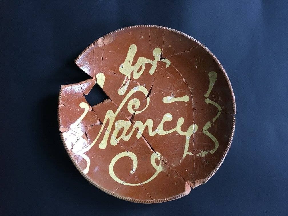 Nineteenth century slip-script red earthenware plate, “For Nancy,” likely made at the Huntington Pottery on Long Island. Recovered from a privy in New York City. Courtesy: Maribelle Costes and Scott Jordan.