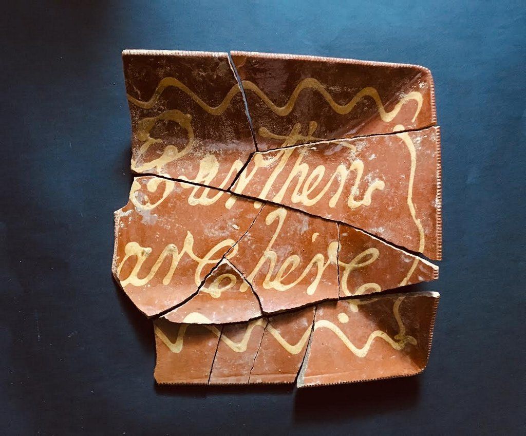 Nineteenth century slip-script red earthenware advertising platter, “Earthen Ware Here,” possibly made by George Wolfkiel in River Edge, New Jersey. The platter was recovered from an 1835-1845 brick-lined privy at 33 Van Duzer Street on Staten Island. Courtesy: Scott Jordan, Maribelle Costes and Dan McGee