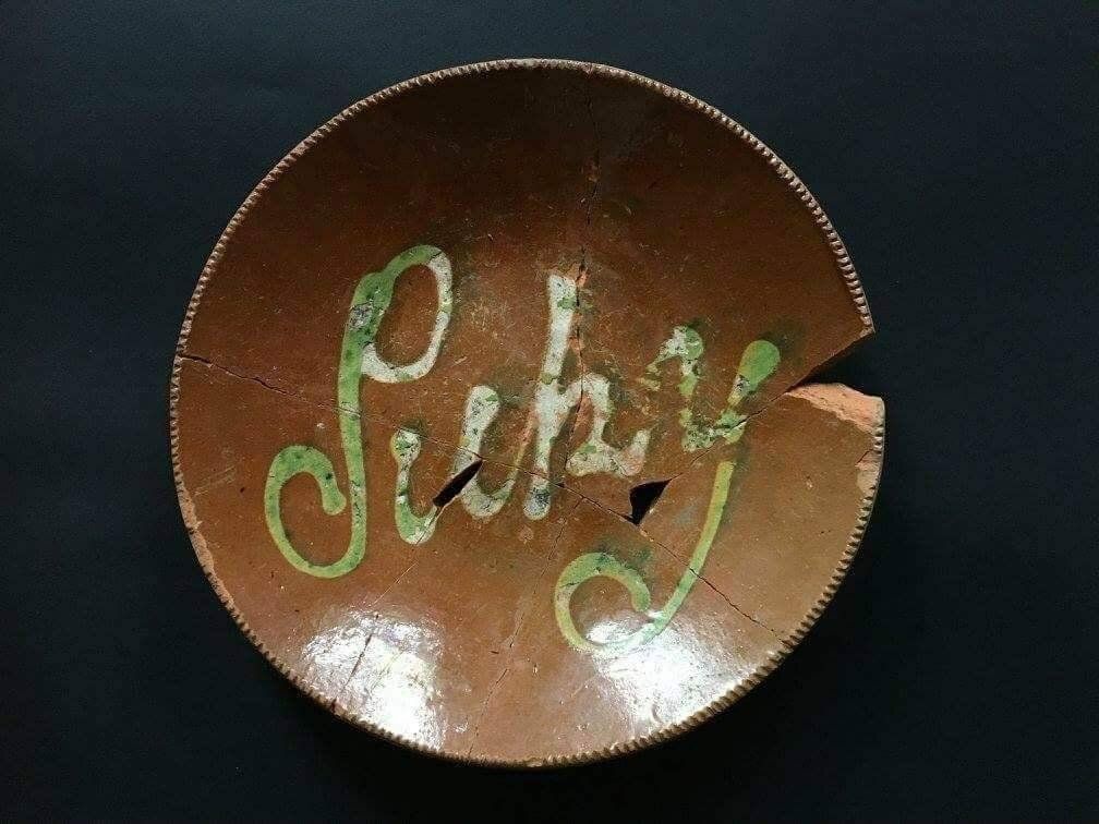 Nineteenth century slip-script red earthenware plate, “Picky,” likely made at the Huntington Pottery on Long Island. Recovered from a 27 foot privy on Houston and Orchard Streets in Manhattan within a circa 1820s-1830s context. Courtesy: Maribelle Costes and Scott Jordan