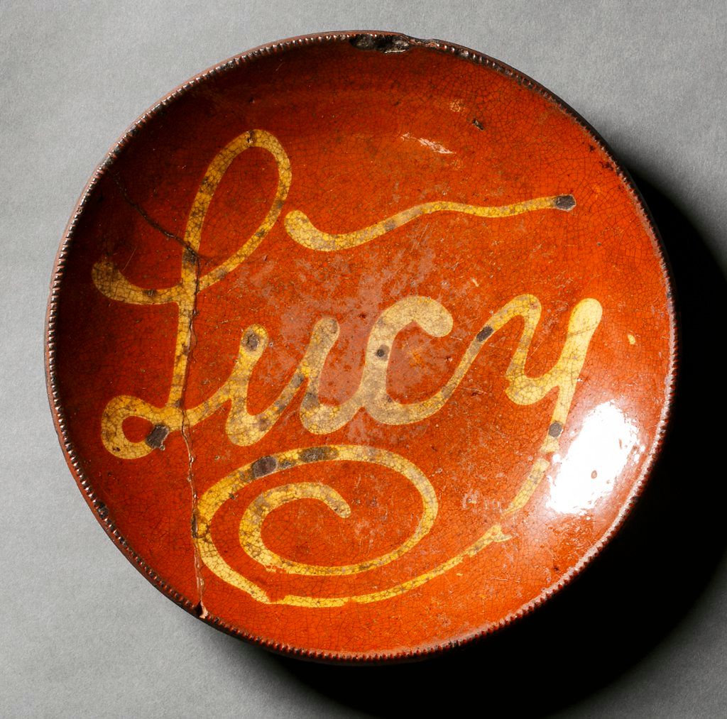 Nineteenth century slip-script red earthenware dish, “Lucy,” made by George Wolfkiel in River Edge, New Jersey. This dish retains a history ownership on Staten Island. Wolfkiel is known for his distinctive curly “Y.” Courtesy: Staten Island Historical Society.