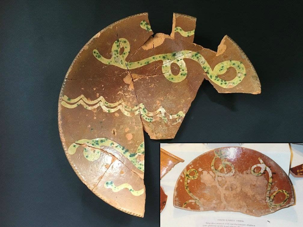 Nineteenth century slip-decorated red earthenware plate attributed to the Huntington Pottery on Long Island. Recovered from a privy in New York City. (Inset photo) Similar nineteenth century slip-decorated plate recovered within an 1840 context on the property of the circa 1730 Suydam House located a few miles from Huntington. Courtesy: Anthony Butera, Jr., Maribelle Costes, Scott Jordan and the Greenlawn-Centerport Historical Association.