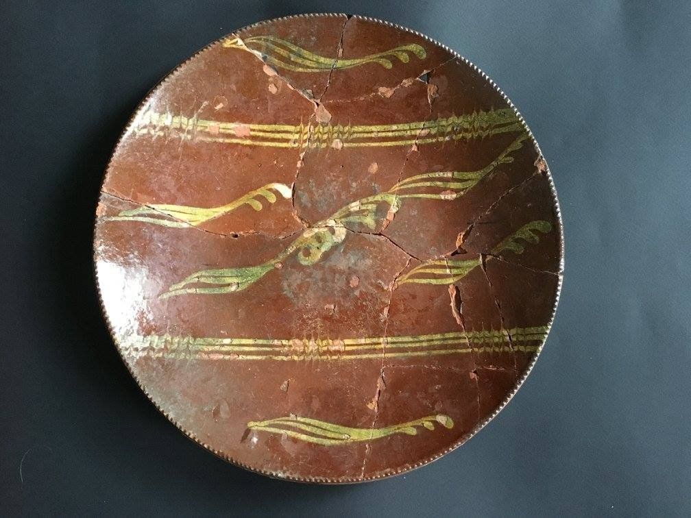Nineteenth century slip-decorated red earthenware plate likely from New Jersey, Long Island or Norwalk, CT, although Absalom Day manufactured similar styles of slip in Norwalk. Recovered from a privy in New York City. Courtesy: Maribelle Costes and Scott Jordan.