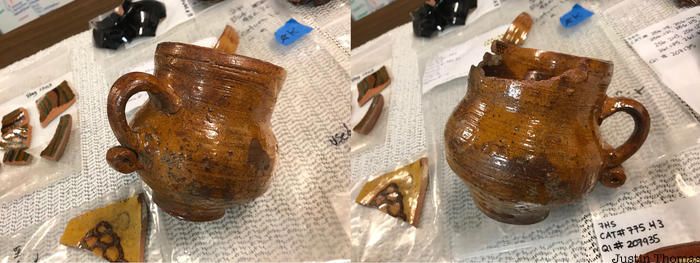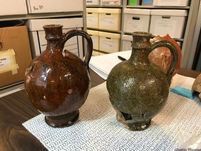 The tavern was built about 1670 and was in operation until around 1706. Archaeologists described the brown- and green-glazed jugs as locally made, possibly from the same potter’s business, and modeled after Dutch production. They also suggested that the jugs might have originally held locally brewed ale or cider. A notable red earthenware mug manufactured with a coiled handle terminal was also recovered from this site.