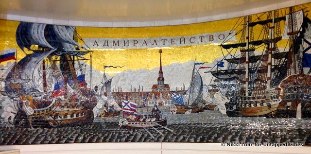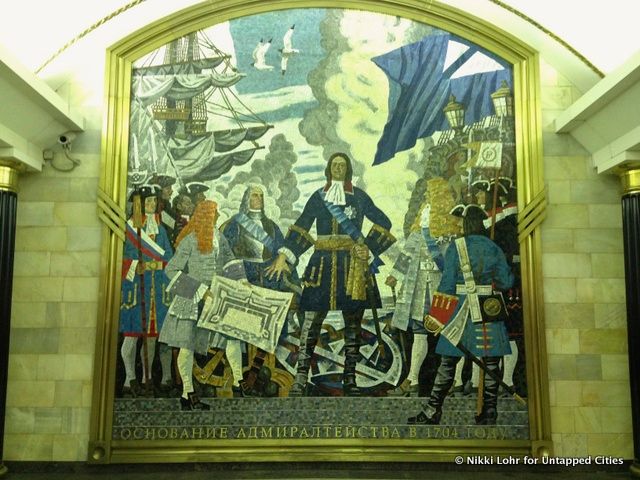 So inside, the station looks brand new. The walls are made of spotless, faux marble panels and shiny gold mosaics, which tell Petersburg history. One shows Peter the Great opening the Admiralty building in 1704. This building was the former headquarters of the Russian Navy and is just a couple blocks away from the station, hence its name “Admiraltey-skaya.”