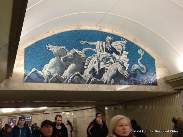 Another mosaic shows a panoramic view of the Navy’s massive ships, which passengers can admire as they descend down the first leg of their escalator ride. And there’s a mosaic dedicated to Poseidon, a nod to the Navy’s ability to master nature’s ferocious seas.