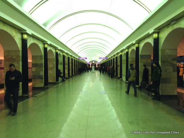Admiralteyskaya is a hot station. It’s in the city’s center and is the stop for tourist destinations like the Hermitage Museum, St. Issac’s Cathedral and the Nabokov Museum. The street it’s on, Malaya Morskaya, was home to Gogol, Tchaikovsky, and Ivan Turgenev author of the 19th-century novel Fathers and Sons.