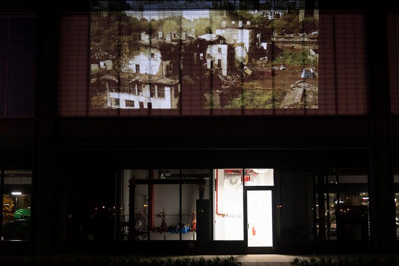 Most of the media recently has focused on the almost cult-like following of Wegman’s and the excitement of New Yorkers to experience the popular grocery store that was founded in Rochester in 1916. But Kensiger and Dorr are reminding New Yorkers of what was lost to bring Wegman’s here: namely, ten historic homes that once housed Navy offices and their families. Preservationist had decried the impending demolition, which led to two buildings saved — though they are arguably the least interesting architecturally though the most conveniently sited. The images projected include Admiral’s Row in its abandoned state, as well as mid-demolition with cranes mid-air, crashing into the buildings, and historic photos.