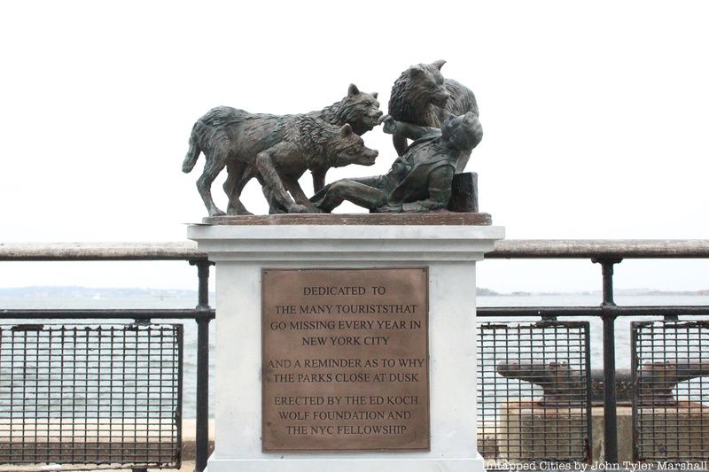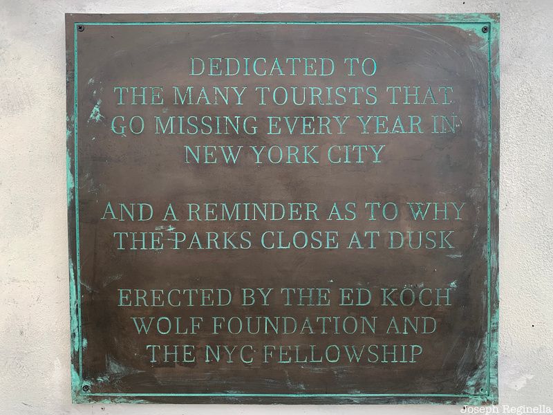 The plaque reads: “Dedicated to the many tourists that go missing every year in New York City. And a reminder as to why the parks close at dusk. Erected by the Ed Koch Wolf Foundation and the NYC Fellowship.”