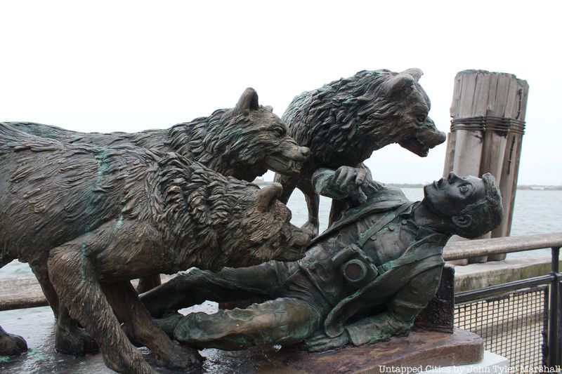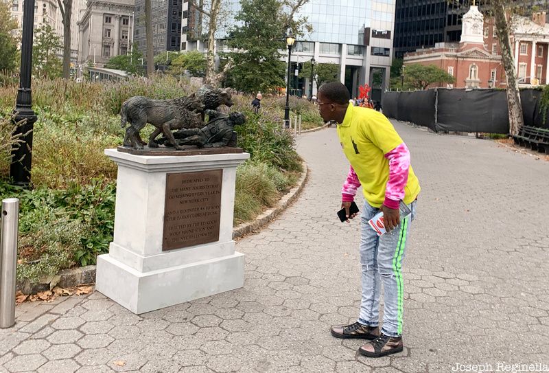 If you have followed our coverage of a certain Joseph Reginella over the past four years, you’ll know where this is going. This is the fourth in a series of hilarious sculptural hoaxes that the Staten Island sculptor takes over to Battery Park to trick tourists (and some locals, no doubt). The first was a monument to a giant octopus that attacked the Staten Island Ferry (gone unnoticed because it happened on the same day as the JFK assassination). A year later was a monument to an elephant stampede on the Brooklyn Bridge. Then a UFO abduction of a tugboat during the Blackout of 1977. “Basically what I am doing is I am creeping into these people’s minds. They are gonna go home to wherever they are from, they google it: ‘Ed Koch releases wolves,’” Reginella told us this past weekend as he gleefully watched passersby take in the sculpture.