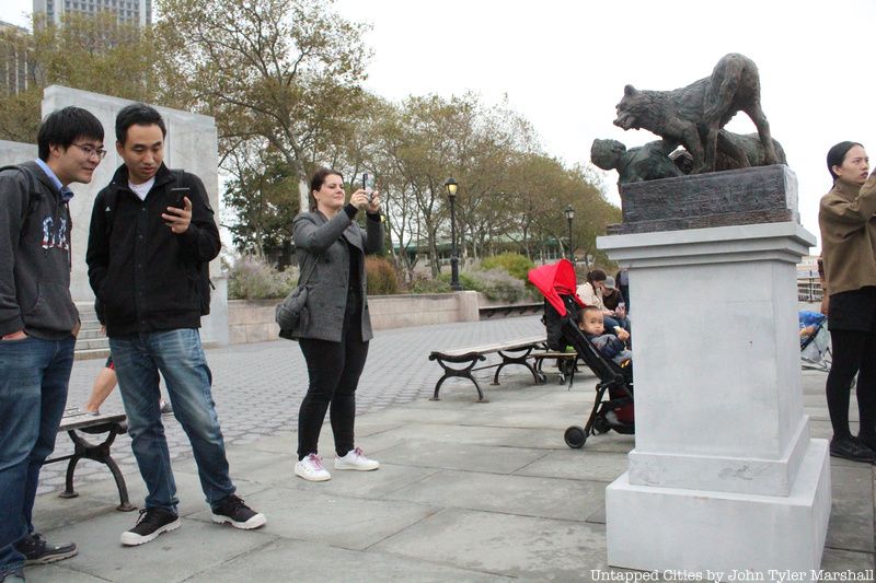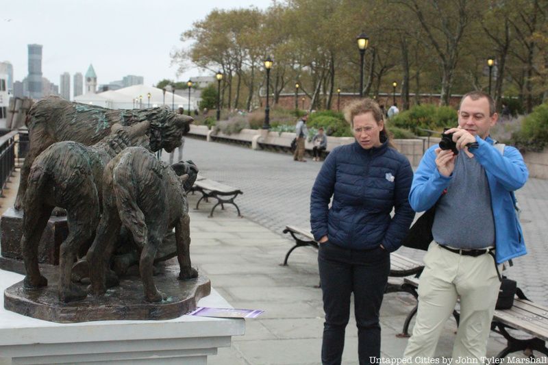 “I chose this location because of the wave of people,” Reginella tells us of Battery Park but the monument to the missing tourists will make appearances over the next few weekends in Washington Square Park, Staten Island and in Brooklyn Bridge Park — Reginella brings over the several hundred pound sculpture by cart. Keep your eye out! The sculpture will be back in Battery Park this weekend on Sunday, October 13th.