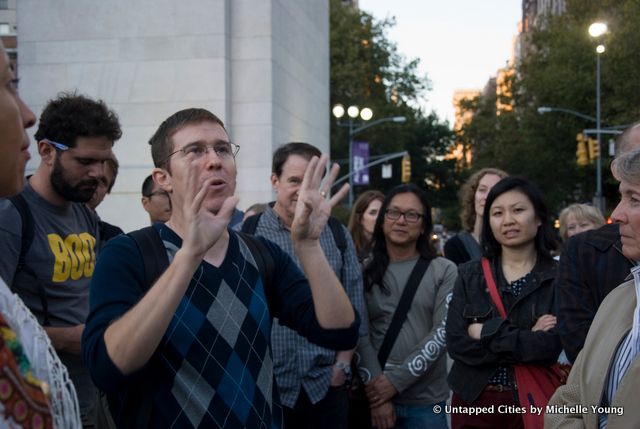 Our next stop was Washington Square Park, and on the way, we talked more about “pigeoneering” styles like the tipplers (trained to fly around and around the roof of a house), tumblers, and the lesser known talents of the birds. For example, pigeons can pass the mirror test (to recognize themselves) and can recognize different styles of paintings–Cubism v. Impressionism, for example.