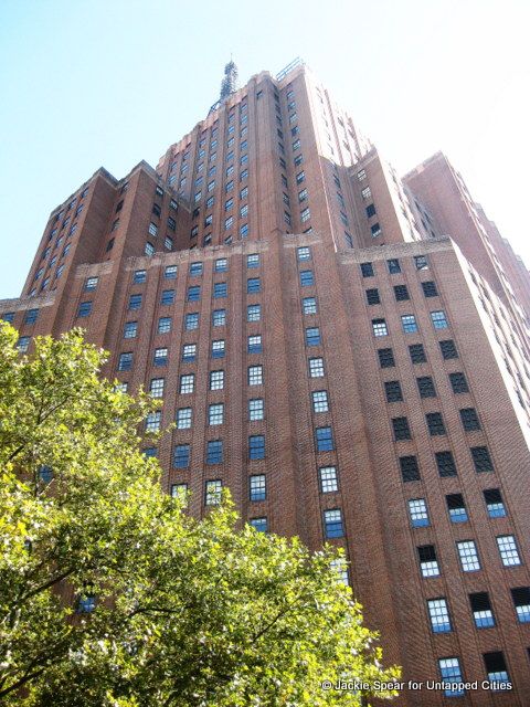 The building across the street from the park was built for AT&T by Ralph Walker in the late 1920s to bring together all of their long distance phone services into a single building. According to “New York 1930”, when they constructed this building, they built an enormous truss over the existing building to keep the original building intact. It was the largest telephone building in New York City at the time of its inception. At the time, 25% of all long distance calls worldwide went through this building. Aside from its sheer height and mass, the most impressive feat accomplished by Walker was that he was able to create a building with such tremendous visual interest when he was only allocated a budget for brick. The setbacks are asymmetrical and the brick originally had an ombre affect, so as your eyes go up towards the skyline it gets lighter. The purpose of this formation of the bricks was to have the illusion of a spotlight being set on the building.